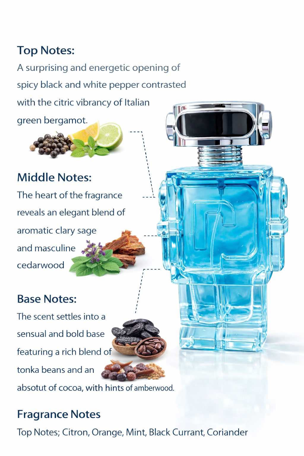 At the heart, aromatic clary sage blends seamlessly with masculine cedarwood, adding depth, freshness, and a smooth woody elegance that feels confident and contemporary.