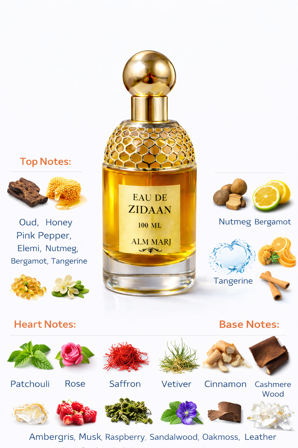 Oud, Honey, Pink Pepper, Elemi, Nutmeg, Bergamot, Tangerine