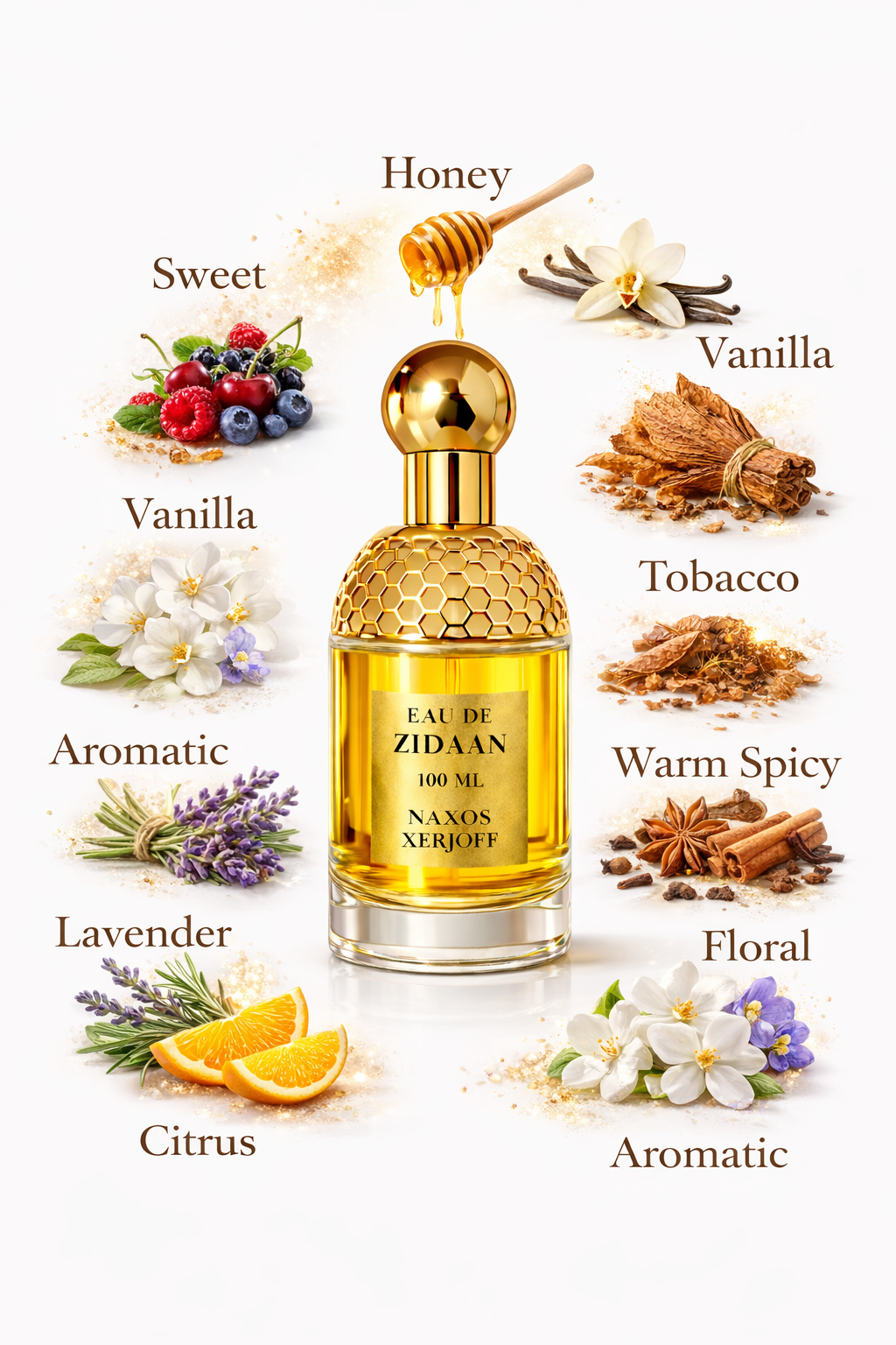 The fragrance opens with a fresh and slightly herbal touch of lavender, giving it a clean yet sophisticated start. As it evolves, a delicious blend of honey and soft florals adds a smooth sweetness, creating an addictive and comforting heart. The dry down reveals a warm, creamy base of vanilla and rich tobacco, wrapped in subtle spicy tones that leave a long-lasting, luxurious trail.